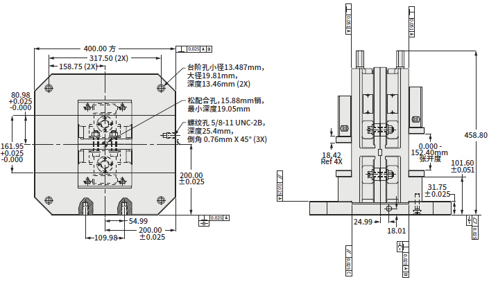 36V2T400 即 3600V鉗背對背安裝在400mm基礎板上(無加高墊塊)