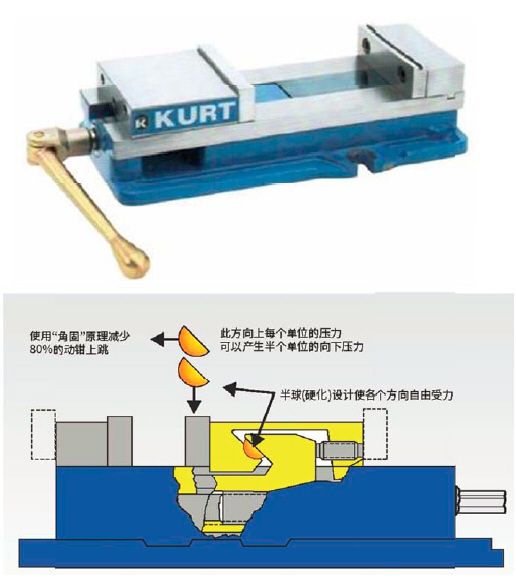 歷史悠久的D系列平口鉗是“角固”式理論較具代表的夾具產品。適用于銑床、磨床及加工中心,用來保證基準面、平面度和平行度等。廣泛地使用于各種機械加工場合進行精密鉆、鉸、攻絲、磨削等。實踐證明,只有無與倫比的Kurt角固式平口鉗才可以保證機械加工的高效和高精度。所有Kurt虎鉗都使用滾針推力軸承,摩擦力小而夾緊力大。