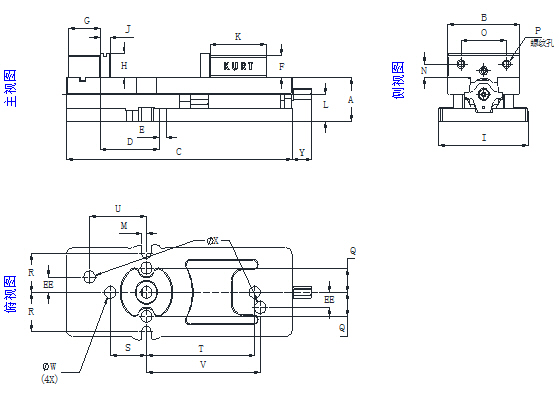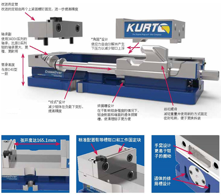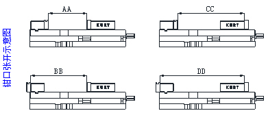 17. DX100完全可以取代D40。 18. 張開度增大(165.1mm代替了98.4mm)。 19. 鉗身高度與D40完全一致。 20. 鉗身變窄以便于在有限的機床工作面上安置更多鉗子并排使用。 21. 增強型軸承(同3400系列)增加使用壽命。 22. 鍵槽與定鉗的距離與D40相同。 |